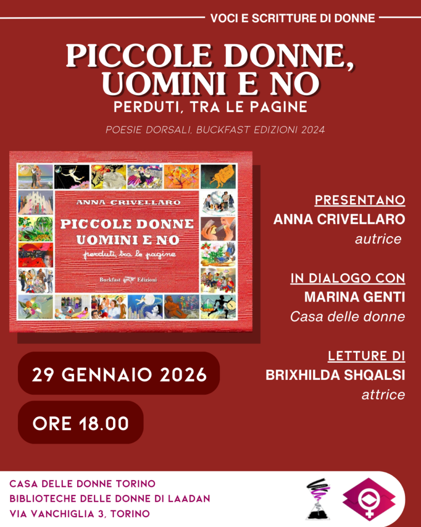 Casa delle Donne e Biblioteche delle Donne di Láadan, per il ciclo Voci e Scritture di Donne, presentano PICCOLE DONNE, UOMINI E NO perduti, tra le pagine, poesie dorsali scritte e illustrate da ANNA CRIVELLARO, Buckfast Edizioni, 2024