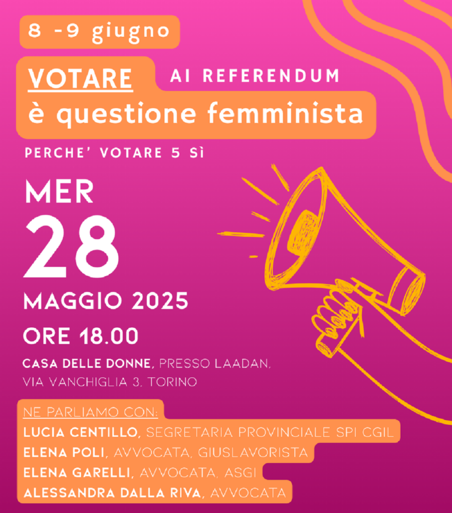 Mercoledì 28 maggio ore 18,00 parliamo dei quesiti del referendum dell’8 e 9 giugno – Intervengono: Lucia Centillo, segretaria provinciale SPI Cgil – Elena Poli, avvocata giuslavorista – Elena Garelli, avvocata, Asgi – Alessandra Dalla Riva, avvocata